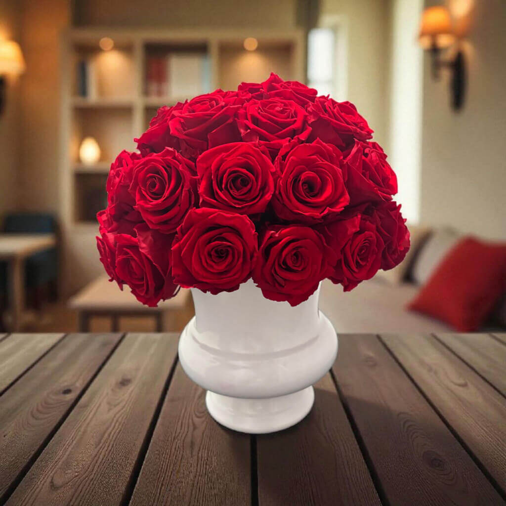 This graceful ceramic vase arrangement holds 25 to 30 hand-placed preserved roses in your choice of color. Designed for refined interiors and lasting impressions, it’s the perfect centerpiece for meaningful spaces — from living rooms to lobbies.