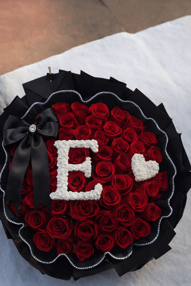 Handcrafted arrangement of 50 fresh red roses, designed with a sophisticated and romantic finish.